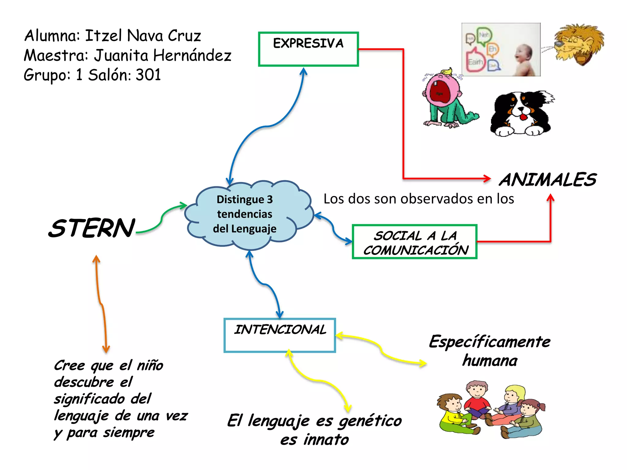 La concepción intelectualista del desarrollo del lenguaje infantil es el aspecto más conocido del trabajo de Stern. Este pensador distingue tres raíces del lenguaje: la tendencia expresiva, la social y la "intencional". Las dos primeras sustentan los fundamentos del habla observados en los animales y la tercera es específicamente humana.
